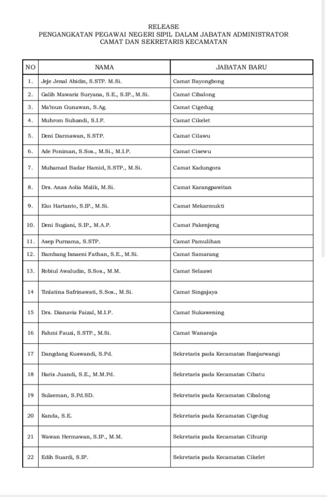 Belasan Camat Dilantik Bupati Garut, Ini Data Nama-namanya